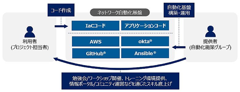 - 提供者(自動化施策グループ):アーキテクチャの設計や運用、共通テンプレートの整備、セキュリティやガバナンスの確保に加え、利用者への導入支援やスキル底上げ