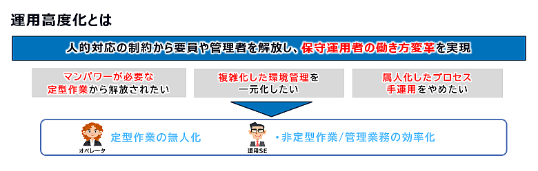 特に、マニュアル化が難しい非定型での複雑な作業や、有識者の判断を必要とする高度な対応については、AIやナレッジを活用した自動化・簡略化が有効です。これにより、作業量の削減だけでなく、運用品質と業務効率を両立しながら生産性を高めることができます。これこそが、運用高度化の本質的な価値と言えるでしょう。