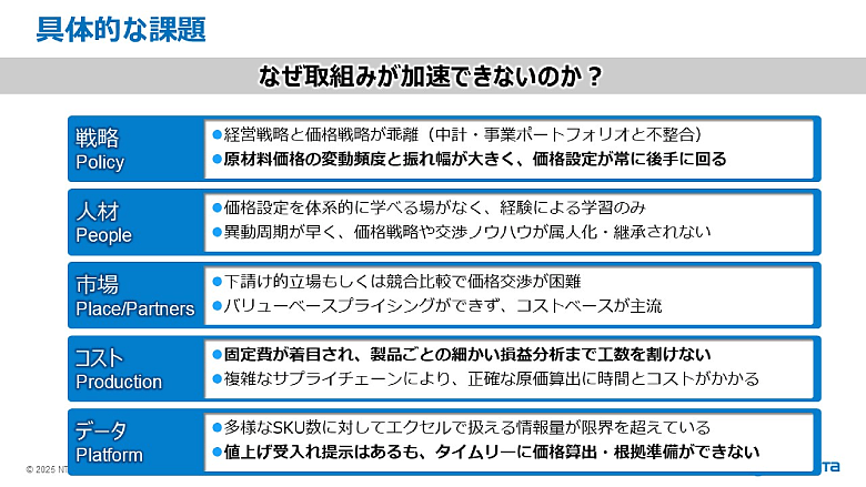 実際、NTTデータが収集したIR情報や企業ヒアリングでは、複数の共通課題が浮かび上がっている。たとえば、製品別の利益が把握できておらず、どのSKUが収益を押し下げているのかが見えない。結果として、値上げの判断が曖昧になり、現場では「どこから手をつけるべきか分からない」といった声が上がっている。