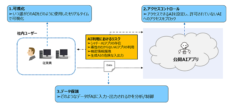 AI利用の増加にともない、従業員による不適切な情報入力やコンテンツ生成・利用をおこなうリスクが増加しています。従業員がAIサービスを利用するシーンにおいては、利用するAIサービスの可視化、サービスへのアクセスのコントロール、入出力されるデータ保護の3つのポイントが重要になります。