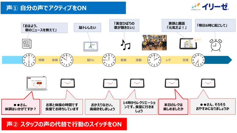 1つ目は、入居者自身の声です。『おはよう』と話しかければ、『おはようございます、今日は〇〇の日ですね』と返答があり、家電操作はもちろん、体操やレクリエーションなどの動画・コンテンツが流れ出し、居室にいながらもアクティブな生活を楽しめます。これにより、自らの意思で活動する“アクティブスイッチ”を入れることができます。