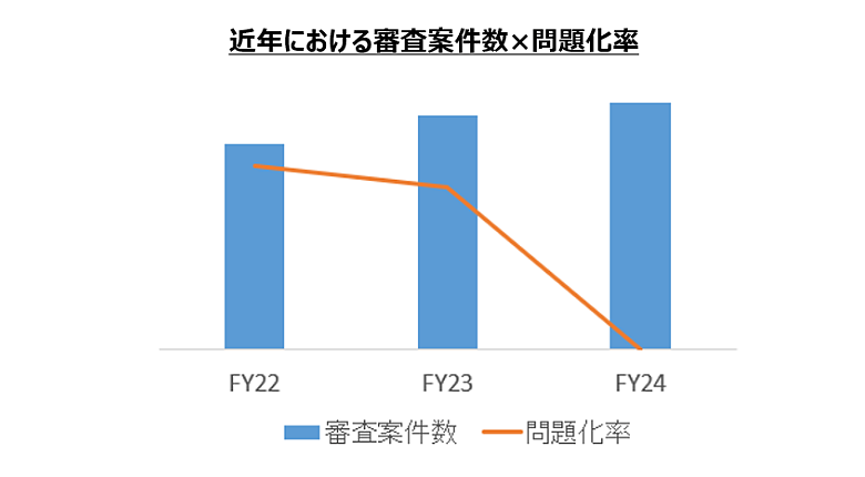 一方で、問題化案件(※1)の比率は低下傾向を示しており、審査体制の成熟とリスク抑制の取り組みが着実に進んでいることが分かります。
