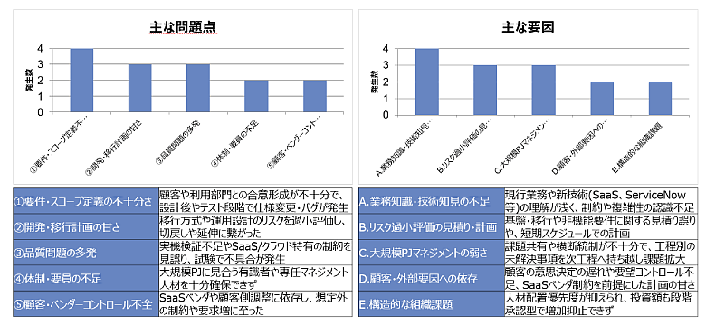 - (1)見積り、コスト:見積前提条件や見積根拠の不足