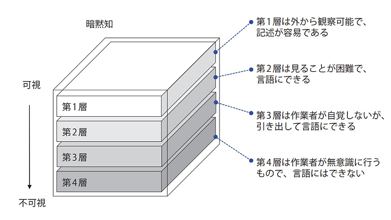 インタビューエージェントは技術・技能教育研究所 森 和夫氏の『暗黙知の継承をどう進めるか』(※1)の理論を踏まえ、プロのインタビュアーの手法に基づいてインタビューを実施します。森氏は、図2のように暗黙知を4つの階層に分類し、各階層に応じて形式知化する方法を記述しています。