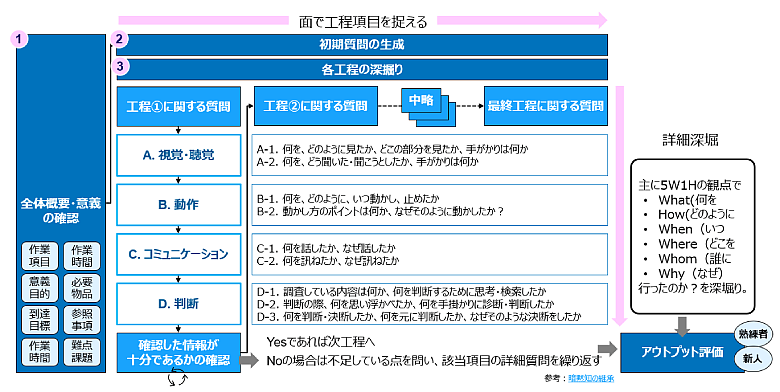 初期質問の目的は深掘りではなく、各工程の基本的な情報(何を、どのように、何のために、何を使い、どの程度で)をヒアリングし、工程ごとの情報の土台を作ることです。先述した森氏の理論を基に、暗黙知を引き出す質問を設計します。次に工程ツリーの各プロセスに対して、汎用(はんよう)的な4観点(A.視覚・聴覚、B.動作、C.コミュニケーション、D.判断)から初期質問を自動生成します。 - ステップ3:各工程の深掘り(深度判定に基づく追加質問の自動生成)