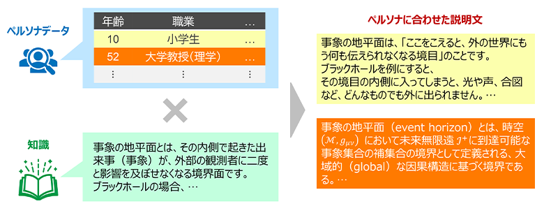 例えば、小学生のペルソナ向けには重要なポイントのみをシンプルに平易に説明した説明文を生成し、専門分野のプロフェッショナル向けには具体的な詳細まで専門用語を含めつつ生成する、といった具合です。