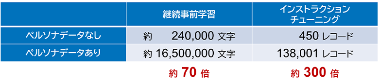 本検証では、ペルソナデータ活用により、低コストで十分な量の学習データを生成できるかどうか、こうして生成された学習データがモデルへの知識追加にも効果的であるかの2点を確認しました。
