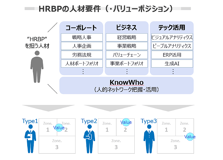 HRBPを導入する際前述2つ目の機能を中心に要件を満たす人材の配置を試みます。しかし、これまで旧来型で進めてきた企業ですべての要件を担う人員を発掘することは現実的ではありません。異なる強みを持つ複数の担当者を配置し、各機能における役割を分担して持続的に実行していくことが重要です。