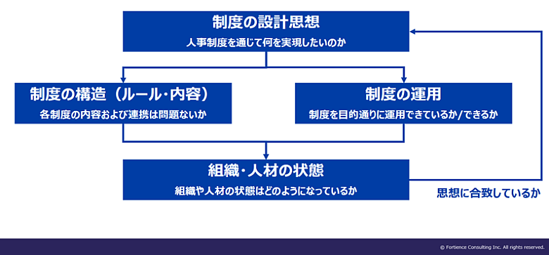 2つ目は「全体を俯瞰した現状分析」です。最初に、人事制度は有機的につながることで人材マネジメントの効果が生まれると説明しましたが、人事制度改革では、人事制度のもたらす影響を俯瞰し、制度全体のつながりを意識した議論を行うことが重要です。具体的には、人事制度によって何を実現したいかという制度の設計思想に基づき、各制度の内容や制度間の連携に問題がないか、さらには、目的通りに制度を運用できるのかを確認します。人事制度の問題点を社内に説明する場合には、その問題が経営や現場の業務にどのような影響をもたらすのか、それぞれの目線に立ちながら説明していくことが大切です。そして、現状分析で忘れてはならないのが、人事制度によって組織や人材がどういう状態になっているのかを把握することです。制度運用により人事制度で実現したいこと(人材の質、等級ごとの人材の量など)ができていない状態となっている場合は、制度内容や運用方法を見直す必要があります。