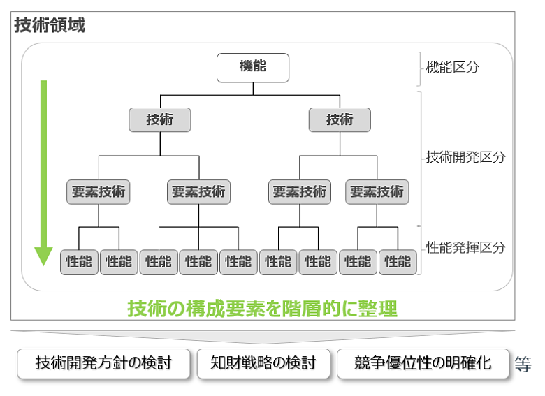 自社技術の競争力を評価するためには、技術を比較・評価可能な単位として定義する必要があります。これには、第3回で述べた「技術の階層的把握」が有効です。技術の階層的把握では、技術を3つの階層:顧客に対して価値を発揮する「機能区分」、その機能を実現する「技術開発区分」、技術に求められる「性能発揮区分」に分解します(図1)。「性能発揮区分」の階層で技術を評価することで、その技術の競争力を明らかにすることができます。