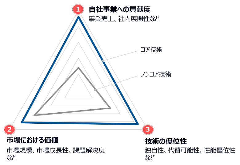 自社の技術資産の可視化では、自社の競争優位性の源泉となるコア技術を特定すること、自社技術の市場における強み・弱みを把握することが、開発方針を立案するうえで重要です。