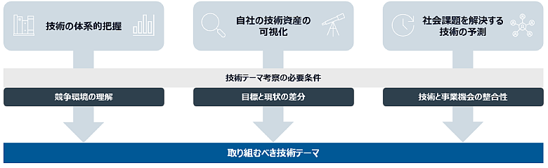 第3回で「技術の体系的把握」、本稿のここまでで「自社の技術資産の可視化」と「社会課題を解決する技術の予測」について述べてきました。これら3つのインプットを活用することで、自社が取り組むべき技術テーマを特定することができます(図6)。