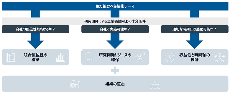 さらに忘れてはならないのは、「組織の意志」を固めておくことです。研究開発の成果がビジネスとして結実するには、しばしば大きな投資と長い期間を要するため、技術テーマを取り組むことに対する経営層からの支持や組織からの共感・理解を十分に得る必要があります。このように、取り組むべき技術テーマの選定に用いた3つのインプットは、戦略的に技術テーマに取り組み、企業価値向上を実現する重要な要素となります。