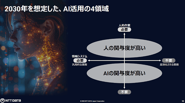 しかし、すべての領域がいきなりAIに置き換わるわけではない。2030年のAI活用は、「情報システムの必要性」と「人的作業の必要性」の2軸で4つの領域に分類できる。
