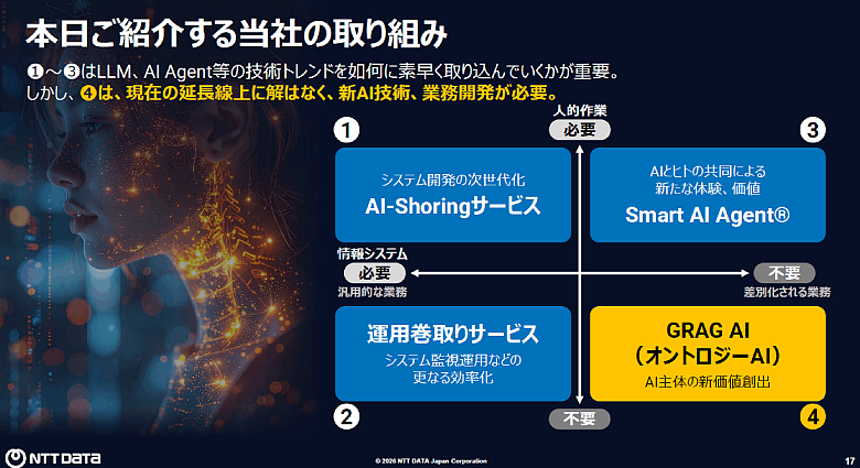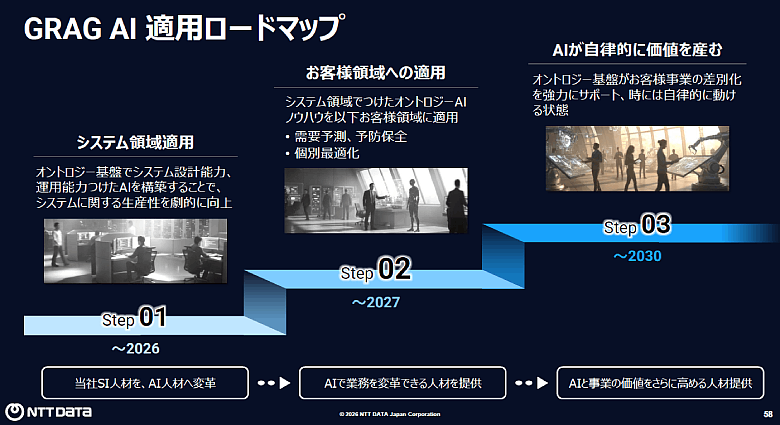 2030年、AIが企業の頭脳となる時代。NTT DATA自身もまた、大きな変革の渦中にある。SI(システムインテグレーション)がAIに置き換わる時代だからこそ、「システムを作る会社」から、GRAG AIを軸に「事業を共創するパートナー」へと進化しようとしている。