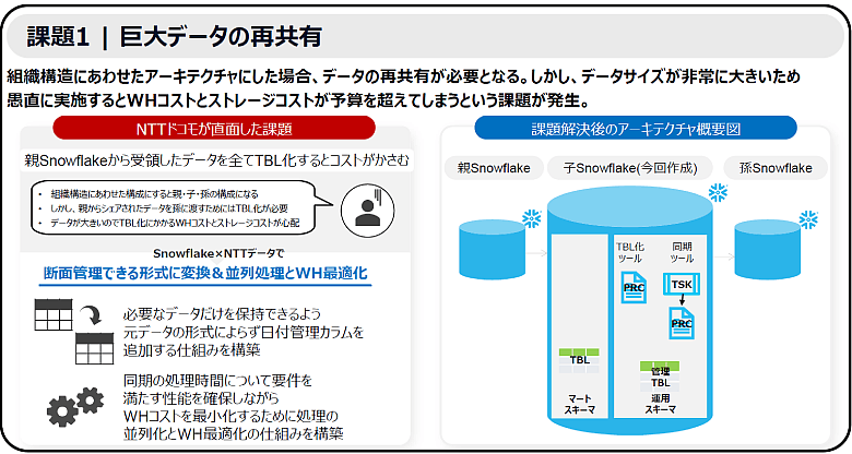 しかし、NTTドコモが扱うのはPB級の巨大データであり、愚直にすべてのデータをコピーして実体化すれば、膨大なコンピューティング(仮想ウェアハウス(WH))コストとストレージコストが発生し、プロジェクトの予算を容易に超過してしまいます。「データによって必要な期間も更新頻度も異なります。これらを一律に処理するのではなく、いかにインタラクティブにコントロールし、コストを最小化するかが最重要課題でした」と生田 氏は語ります。