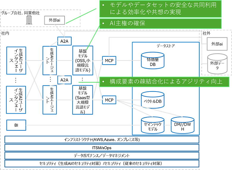多様化する生成AIの用途と性能、セキュリティガバナンス、コストを保つために、今後は、用途に応じたさまざまな規模の言語モデルとデータを疎結合にし、マルチエージェントで業務課題を解決する「自社運用型AI」に移行すると、筆者は考えています。特に、基盤モデルにおいては、OSSと商用モデルのハイブリッド活用により、企業や業界ごとの独自のAIエコシステムが形成されるでしょう。それらの運用は、インフラストラクチャやデータガバナンス/データマネジメント、統合的なセキュリティ対策といった非機能要素によって支えられていくものと考えられます。