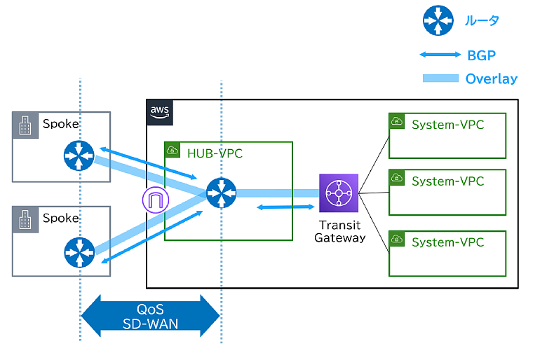 仮想ルーターとTransit Gateway Connect などを利用することで、オンプレミスからAWSまでを1つのBGPドメインとして設計できます。これにより、拠点追加が頻繁な環境や、M&A後のネットワーク統合にも迅速に対応可能なネットワークを実現できます。
