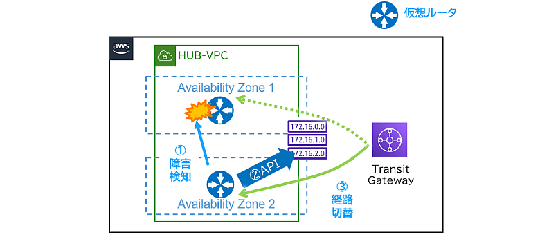仮想ルーターがAPIを用いてVPCのルートテーブルを書き換えることでHA構成を実現する手法です。障害発生時には、待機系ルーターがAPIを実行し、トラフィックを自動的に切り替えます。