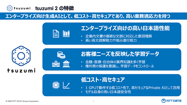 こうした要件に対応する選択肢の一つが、NTTがフルスクラッチで開発した生成AIモデルである「tsuzumi 2」です。tsuzumi2は、1GPUで動作可能な軽量モデルでありながら、超大型モデルに迫るトップクラスの性能と、高い日本語処理能力を備えています。パラメータサイズが小さいため、学習やチューニングに必要なコストを抑えられる点も特長です。さらに、金融・自治体・医療分野に関する知識を幅広く学習しています。