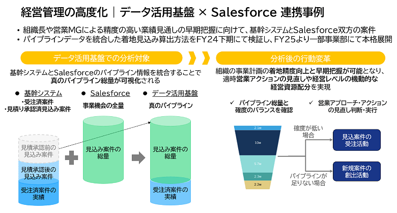 その効果がよく表れたのが、SFAと案件管理システムのデータを統合し、パイプライン総量を可視化した取り組みです。従来は、SFAに蓄積された見込み案件と案件管理システムに蓄積された受注案件が別々に管理されており、全体像を把握しにくいという課題がありました。そこで本基盤上で両者を統合し、営業マネジメント層が着地見込みを早期に把握できるようにしたことで、パイプラインの量と質のバランスを見ながら、営業アクションを前倒しで判断できるようになりました。