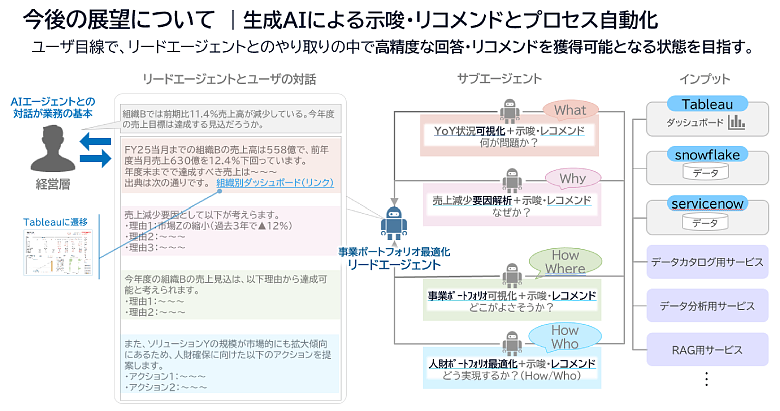 データ活用基盤の今後の展望について、依田は次のように語ります。「今後は、より高度な活用に向けて、データ分析のフロントシステムとして生成AIを活用していくことを考えている。例えばユーザーはAIエージェントに『売上の異常要因を調べて」と依頼するだけで、AIエージェントが各システムのデータやカタログ、分析サービスなどを参照しながら、最適なアウトプットを提示してくれる--そんな形をめざしている。」