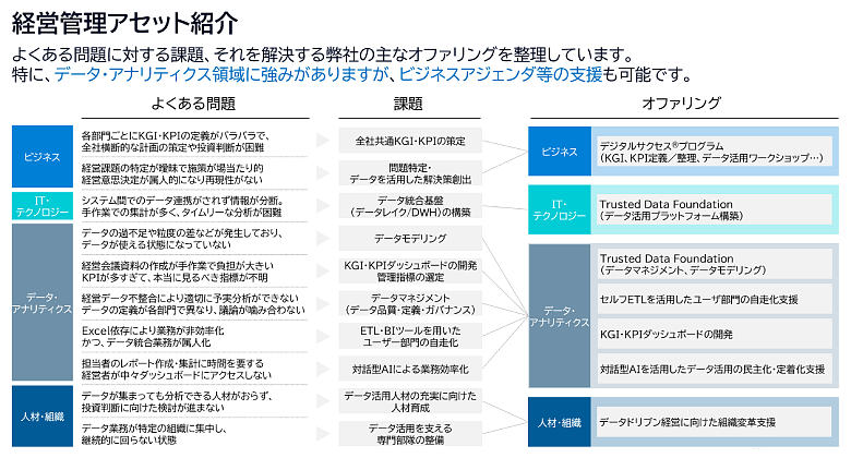本記事でご紹介したデータ活用基盤構築・活用推進におけるノウハウを整理し、実際の導入や運用に活用いただけるサービスとしてご提供しております。お客さまのデータドリブン経営への変革を支援させていただきますのでお気軽にご相談ください。