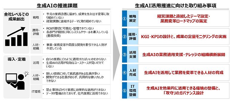 生成AIを活用した事業・業務変革の過程において、「導入・定着」課題と「全社レベルでの成果創出」課題が存在します。前者は利用率やユースケースの広がりなど利活用に関する論点が中心となり、後者は生成AI活用をいかに経営課題と結び付け、変革を構想・実行するかが論点となります。これらの課題を解決し、全社レベルで生成AI活用を推進するために取り組むべき項目は次の5つです。
