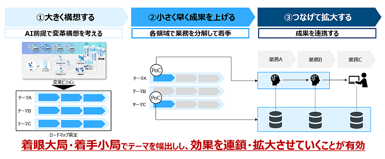生成AIは、今の事業・業務を根底から変えてしまうほどの強力なテクノロジーです。そのため、「現在どのように業務を行っているか」というAS-IS分析をやりすぎることは非効率になる可能性があります。一方で、業務の自動化を一足飛びに実現できるわけではありません。業務を分解し、生成AIを部分的に適用して、AIエージェントによる自動化を進めた上で、それらを段階的に連携していくという地道なステップを踏む必要があります。NTTデータが推奨する生成AIを活用した変革アプローチは、「大きく構想する」→「小さく早く成果を上げる」→「つなげて拡大する」です。