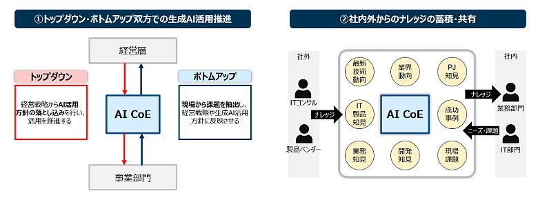 第一に、経営戦略から生成AI活用方針を落とし込みつつ現場の課題を吸い上げて計画へ反映する「トップダウン/ボトムアップ双方向の推進」です。経営層が策定する全社戦略を踏まえ、生成AI活用戦略を具体化し、ROIの可視化やユースケースの創出を通じて事業部門での活用を促進します。また、IT部門と連携し、ルール設計や共通基盤の構築支援など生成AI活用のための環境整備を促進します。