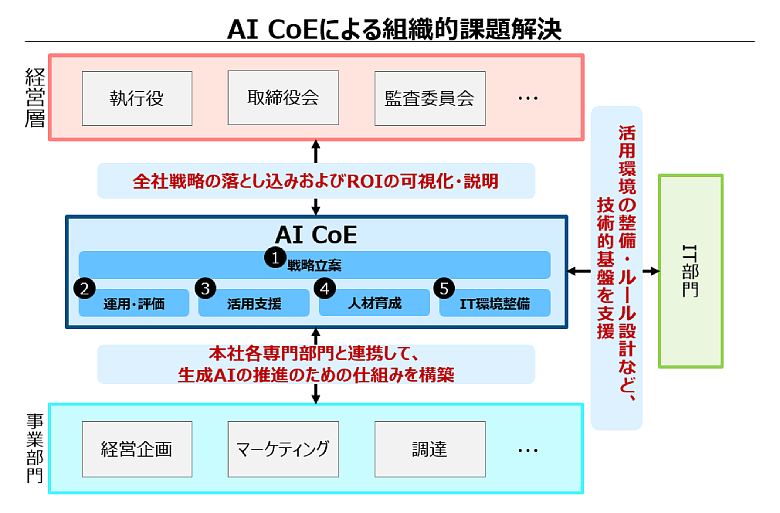 AI CoEは冒頭で説明した「生成AI推進5つの柱」を実行する機能を持ち、課題やニーズに応じて各部門に対してその機能を提供します。