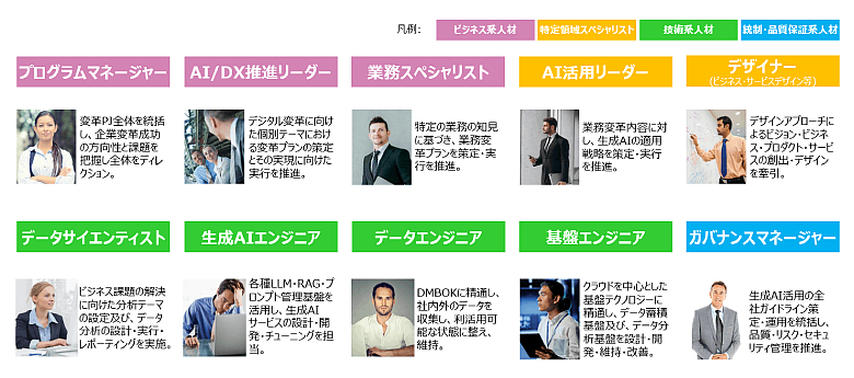 AI CoEの支援内容は、ビジネスからテクノロジー、人材など多岐にわたります。そのため、AI CoEは企業のニーズや課題に応じて多様な人材タイプを組み合わせ、適材適所で支援を提供できる体制の構築が求められます。以下に、その人材タイプの例を示します。
