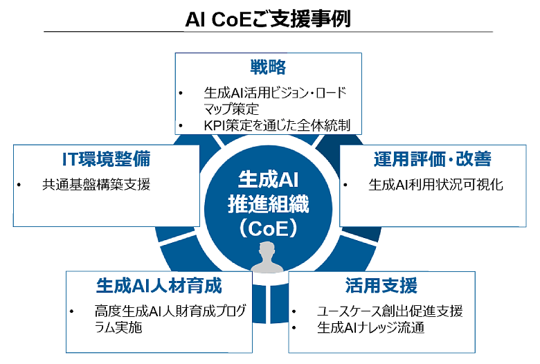 AI CoEはこれらの人材タイプから構成され、経営層・事業部門・IT部門に対して生成AI活用の推進に必要な支援を行います。これにより、部門単位で局所的に進みがちな取り組みを、共通の優先順位・指標・ガバナンスのもとで推進し、全社最適で迅速に展開するとともに、成果を横展開可能な環境を整備します。