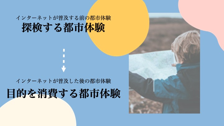 すなわち、インターネットが普及した後の都市体験は、目的を明確にした上で訪れ、「目的を消費する都市体験」に変わったのです。