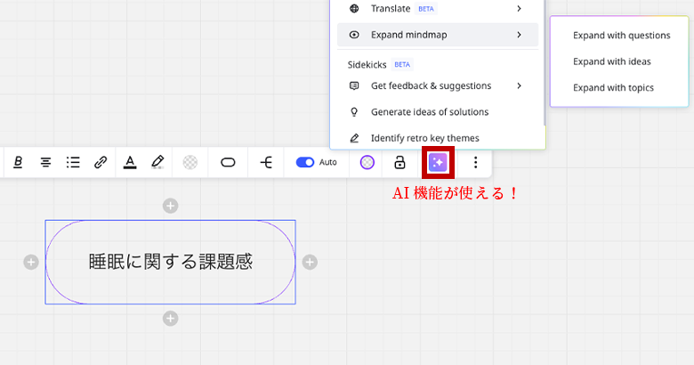 アイデアの幅出しをするため、まずMiro AIの機能を使ってマインドマップを作成しました。