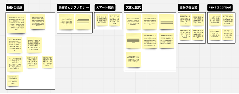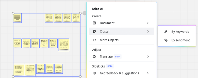 ひたすらアイディエーションをした後、キーワードによるクラスター作成もMiro AIが行ってくれました。ボタンひとつで綺麗にまとめられるので、とても便利です!