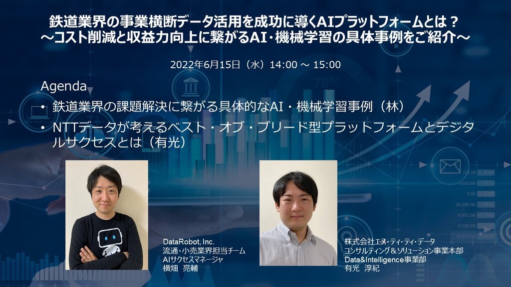 本セミナーでは、鉄道業界の課題解決に繋がる具体的なAI・機械学習事例や、様々な業界で成果を創出しているAI Cloud プラットフォーム「DataRobot」のデモをご紹介します。