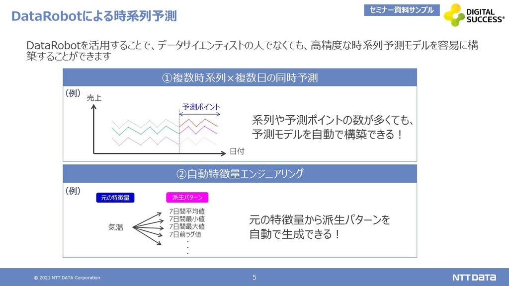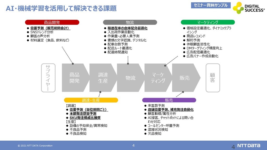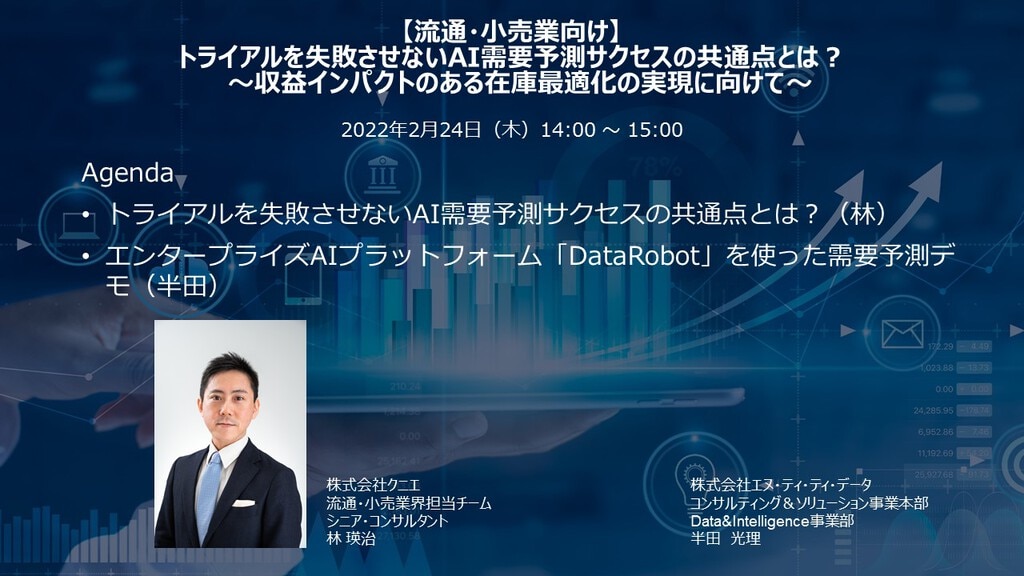 本セミナーでは、NTTデータ・クニエがこれまで支援してきたAI・機械学習導入プロジェクトの知見を踏まえ、AI・機械学習の活用を企画やトライアルで終わらせず、実装を通じてビジネス効果を生み出すために必要なことを、事例を交えてお伝えいたします。また、AIによる需要予測を実現するための方法として、エンタープライズAIプラットフォーム「DataRobot」を使った需要予測デモもご紹介します。