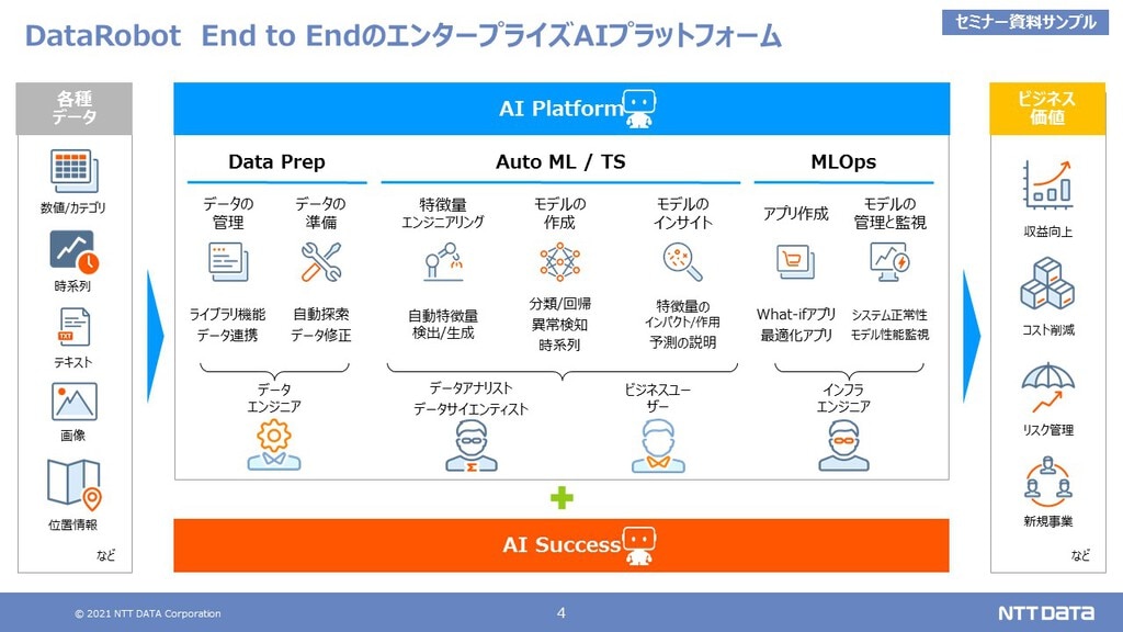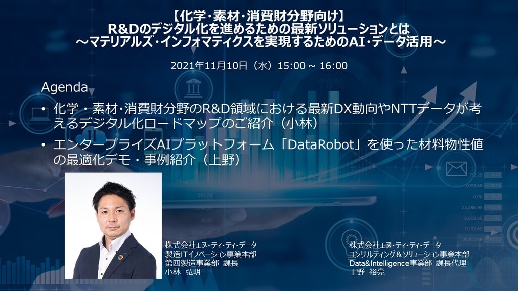 本セミナーでは、化学・素材・消費財分野のR&D領域における最新DX動向やNTTデータが考えるデジタル化ロードマップのご紹介を交えつつ、エンタープライズAIプラットフォーム「DataRobot」を使った材料物性値の最適化デモやマテリアルズ・インフォマティクスの最新事例をご紹介させていただきます。